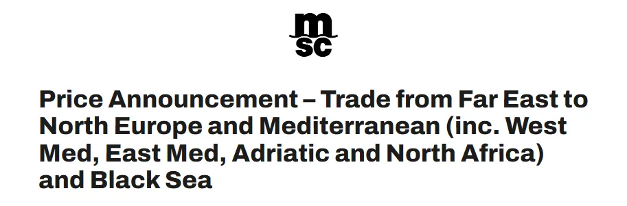 MSC announced new port‑to‑port rates from all Far East ports (including Japan, Korea and Southeast Asia) to North Europe, the Mediterranean (West & East), the Adriatic and North Africa, and to Black Sea ports. The new rates are effective December 15, 2025 until further notice (but not beyond December 31, 2025, unless extended).