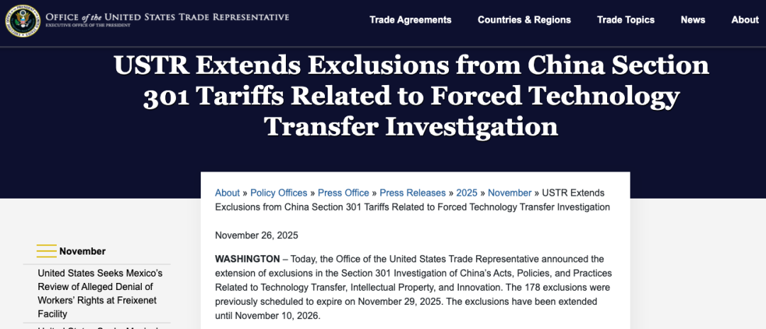 Read the USTR press release: USTR: Extends exclusions related to China Section 301 tariffs (Nov 26, 2025)